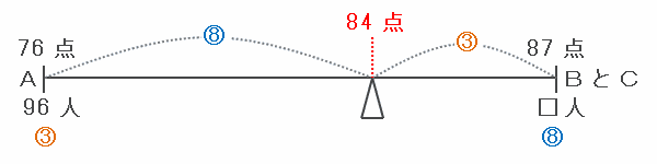 「平均76点のA小学校の生徒96人」と「平均87点のB小学校とC小学校の生徒□人」を混ぜ合わせると、全体の平均点が84点になるので、次の図のように