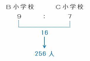 次の図のように、B小学校とC小学校の6年生の人数比は9:7なので、比の9+7=16が256人にあたります。