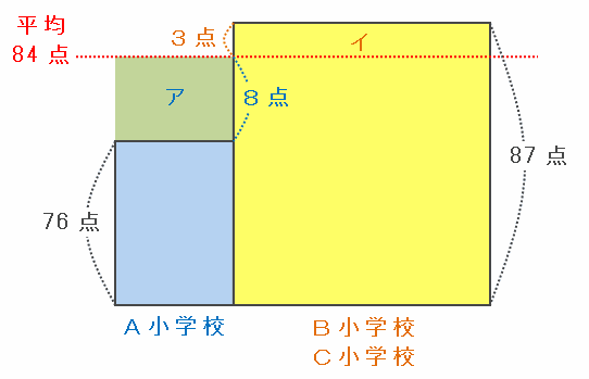 上の図のイがアの部分に流れ込んだ結果、3つの学校の平均点が84点になるので、アとイの面積は同じです。
