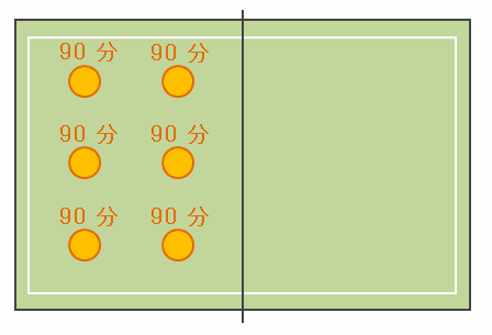 バレーボールは6人でやるスポーツなので、試合中の1時間30分=90分間は、次の図のようにレギュラーまたは補欠のうちの6人がコートに立っているはずです。