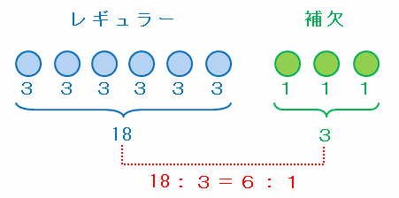すると、レギュラー6人の出場時間の合計は6×3=18、補欠3人の出場時間の合計は1×3=3なので、レギュラーと補欠の出場時間の比は18:3=6:1になります。
