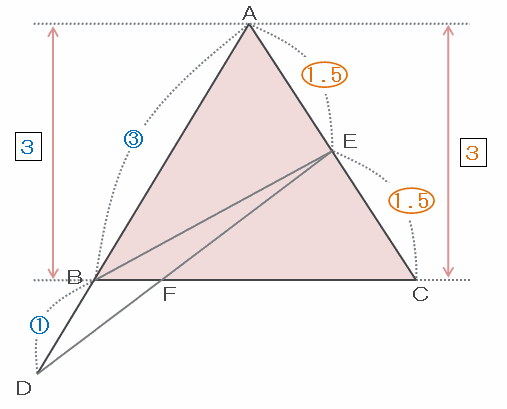 そこで次の図のように、辺AEとECの長さの比を1:1ではなく1.5:1.5と表せば、高さの比が3にそろいます。
