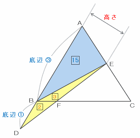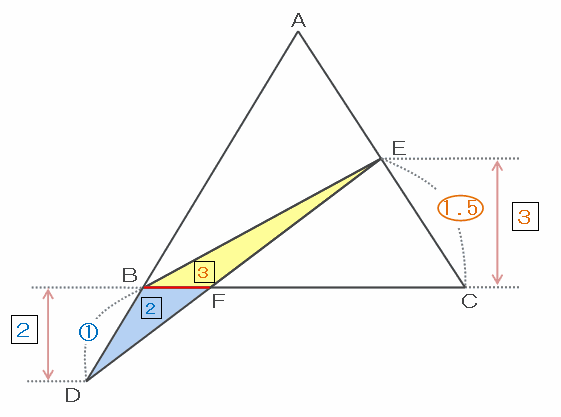 次の図の三角形BFDとBFEは、底辺BFが共通で高さが1:1.5=2:3なので、面積比もBFD:BFE=2:3となります。