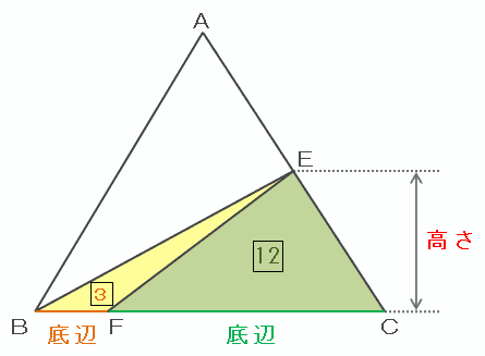 次の図の三角形EBFとEFCは高さが同じなので、底辺の長さの比は面積比と等しくなります。