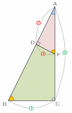 次の図の三角形ABCとAFDを比べてみると、角ACBとADFはどちらも直角で、角DAFは共通なので、この2つの三角形は内角の関係から相似であることが分かります。