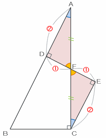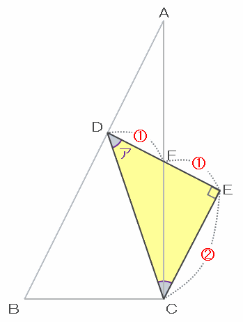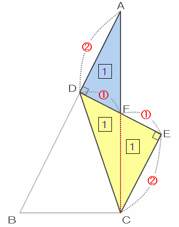 つまり次の図のように、三角形CEDは角CEDが直角で、辺ECとDEの長さはどちらも比の2と表せるので直角二等辺三角形であることが分かります。
