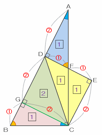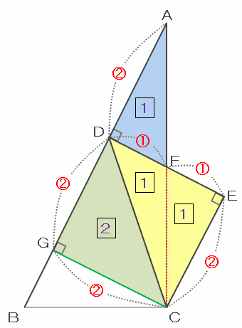 また、辺ADとGCの長さはどちらも比の2なので、三角形AFDとCBGは合同であり、三角形CBGの面積はAFDと同じく比の1と表せます。