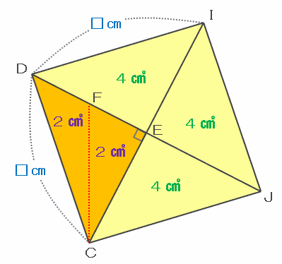 また、下の図のようにCEDと合同な直角二等辺三角形をくっつけると正方形DCJIができ、その面積は4×4=16㎠になります。
