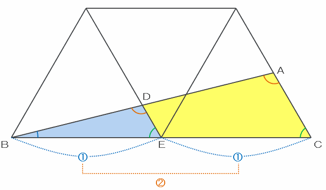 三角形BDEとBACを次の図のように並べて比べてみると、この2つの三角形は内角が等しいので相似であり、長さの比は辺BEとBCとの関係から1:2です。