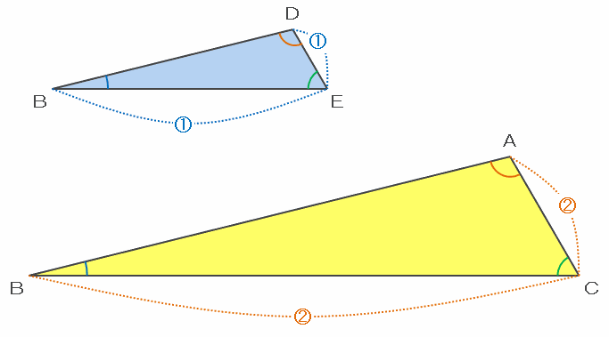 また、辺DEとACは平行なので、角BDEとDAC、角DEBとACEの大きさはそれぞれ等しいことも分かります。