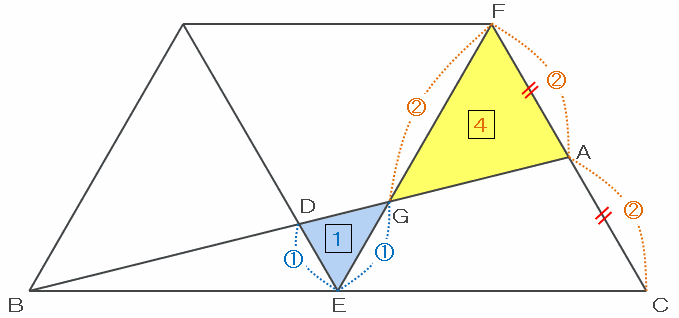 また、三角形DEGとAFGは8の字相似の関係で、対応する辺の長さの比はDE:FA=1:2なので、三角形DEGとAFGの面積比は1×1:2×2=1:4となります。