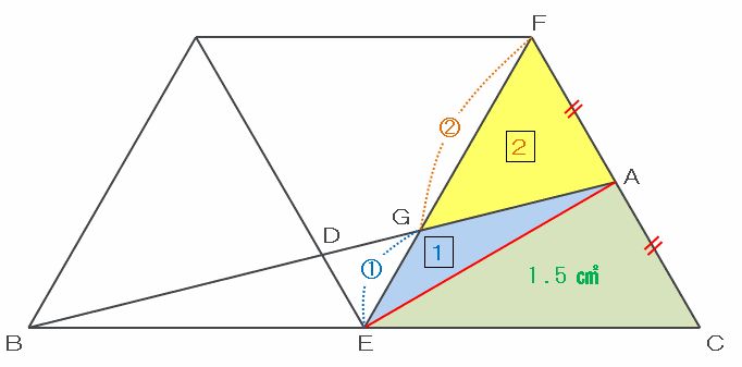 つまり、上の図の三角形FEAの面積を1:2に比例配分すれば三角形AGEとAFGの面積がそれぞれ求められるので、三角形AGEの面積は1.5×3分の1=0.5㎠、そして三角形AFGの面積は1.5×3分の2=1㎠になります。