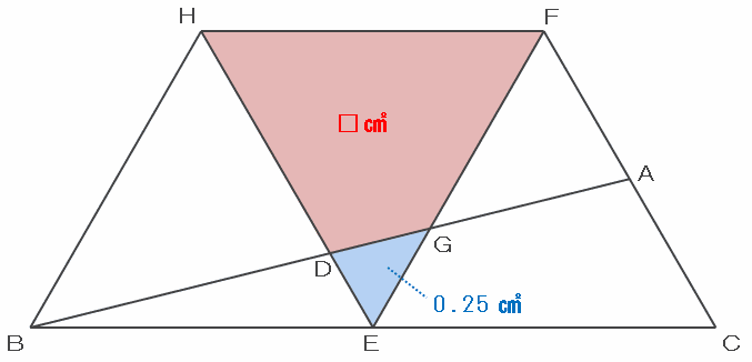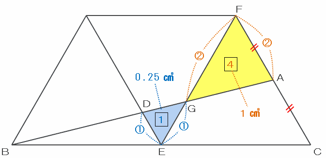次の図の三角形AFGの面積は1㎠、そして三角形DEGとAFGの面積比は1:4なので、DEGの面積は1÷4=0.25㎠です。