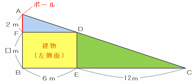 □には1×12÷3=4があてはまるので、DEの長さ(つまり建物の高さ)は4mになります。