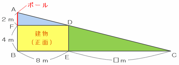 今度はこの土地を真正面から見てみると、青い三角形AFDは、ポールの高さであるAFと底辺にあたるFDの長さの比が2m:8m=1:4になっています。
