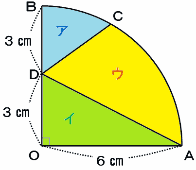 イは単なる直角三角形なので、面積は6×3÷2=9㎠とすぐ求められるのですが、おうぎ形のニセモノであるアの面積を求めるのはちょっと大変そうですね。