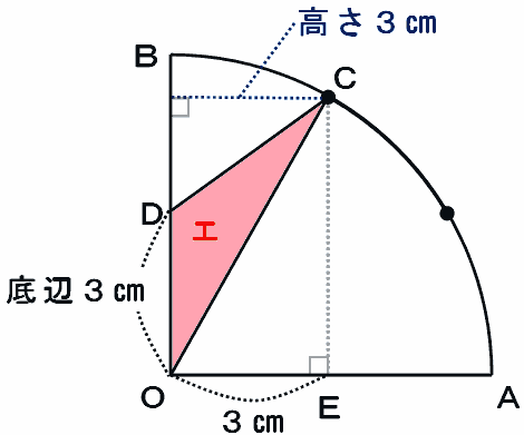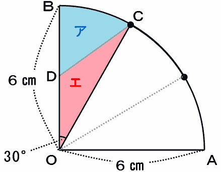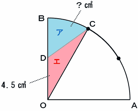 でもアの面積だって、次の図のアとエを合わせた面積(おうぎ形BOC)からエの面積を引けば求められます。