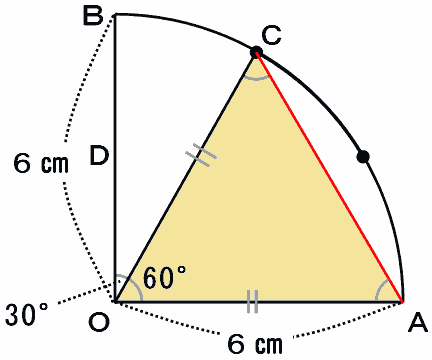 上の図の辺OCと辺OAは長さが等しい(どちらもおうぎ形の半径)ので、三角形COAは二等辺三角形です。