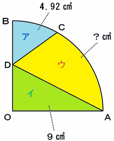 つまり、三角形CODの面積は3×3÷2=4.5㎠、そして次の図のアの面積は9.42-4.5=4.92㎠になることが分かります。