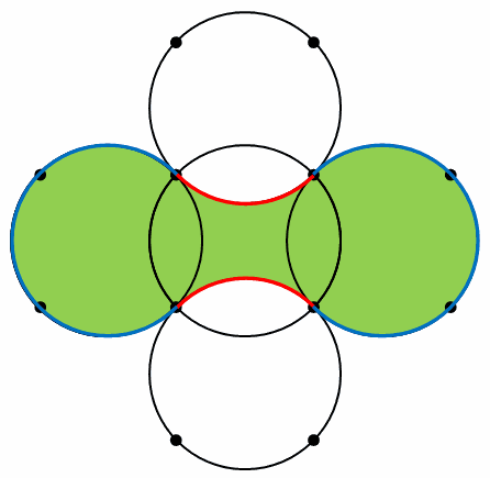 次の図は、半径10㎝の円が組み合わさってできており、たがいに円周を4等分する点で重なっています。円周率を3.14として、次の問いに答えなさい。