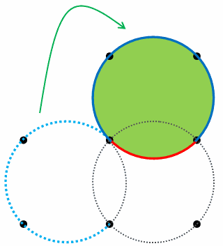 上の図のように、左側にあった青い線をパカッと取り外して上にはめると、青い線と赤い線で円が1個できます。