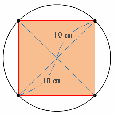 次の図のように、この赤い正方形の対角線は円の直径と等しいので10×2=20㎝です。