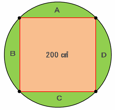 緑色4か所の面積の合計は、次の図のように円の面積から赤い正方形の面積を引けば求められるので、10×10×3.14-200=114㎠になります。