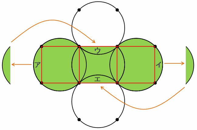 とりあえず次の図のように、緑色の部分の左右のはしにあるアとイをたてにスパッと切り取って、それをアはウに、イはエにパカッとはめ込みます。