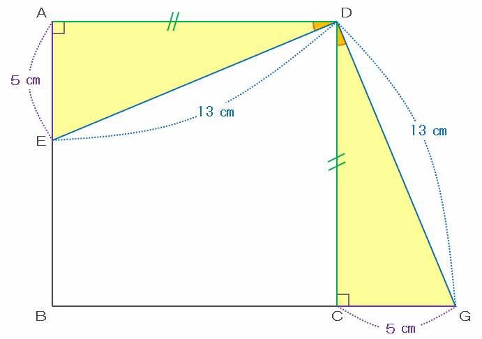 次の図の直角三角形AEDとCGDは、どちらも斜辺の長さが13㎝で緑色の辺は正方形の1辺なので、2組の辺の長さが同じです。