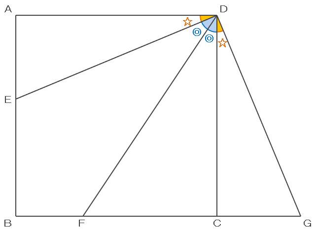 次の図の角EDFとCDF、角ADEとCDGの大きさはどちらも等しいので、それぞれ◎と☆とします。