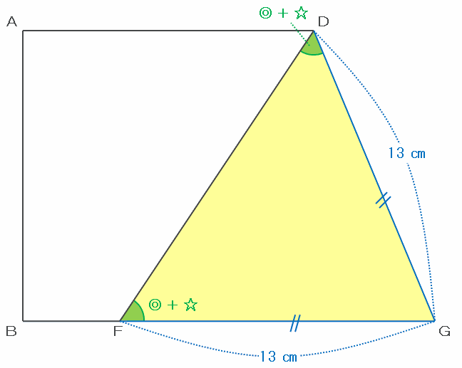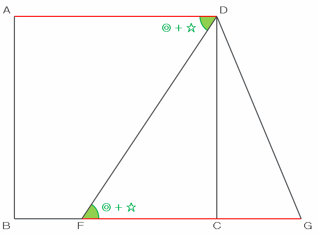次の図のように、角GDFとGFDの大きさはどちらも「◎+☆」であり等しいので、三角形GDFは辺GDとGFの長さが等しい二等辺三角形です。
