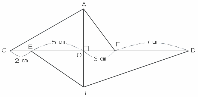 次の図のように、ABとCDは点Oで直角に交わっています。三角形OACと三角形OBDの面積の和が30㎠、三角形OBEと三角形OAFの面積の和が14㎠のとき、ABの長さを求めなさい。