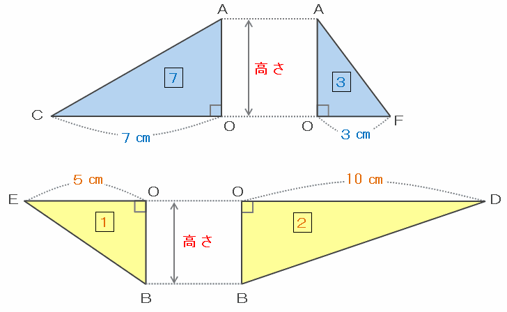 また、三角形OBEとOBDも高さが等しいので、面積比は底辺の長さの比と同じく5:10=1:2となります。