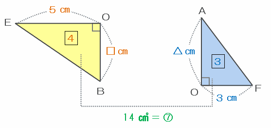 また、三角形OAFの面積を求める式は3×AO÷2=6㎠と表せるので、辺AOの長さは6×2÷3=4㎝です。