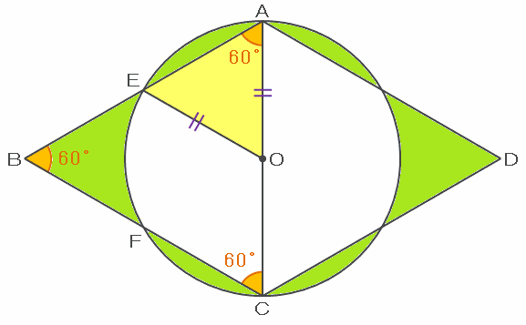 下の図の辺OAとOEはどちらも円の半径なので長さが等しく、角OAEは正三角形ABCのひとつの内角なので60度です。