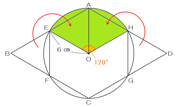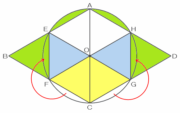 最後は下の図のように、左右にあった緑色の正三角形BEFとDHGをそれぞれOAEとOHAに移すと、求める面積はおうぎ形OEHになります。