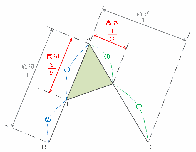 ・三角形AFEの高さ→AE:EC=1:2なので、ABCの高さの3分の1