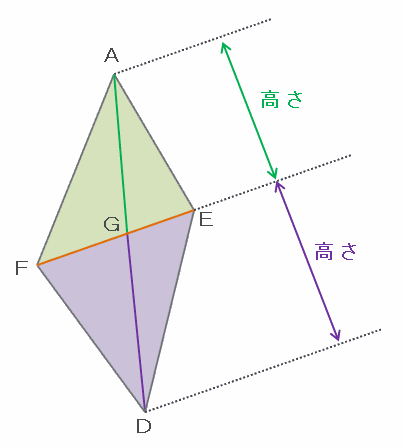 次の図の三角形AFEとDFEは、底辺はどちらもFEなので、面積比と高さの比が等しくなります。