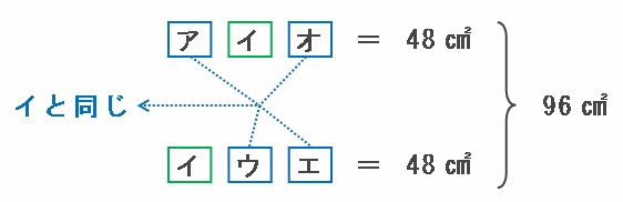下の図のように「アイオ」と「イウエ」を並べてみると、その面積の合計は48×2=96㎠になります。