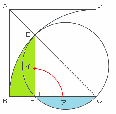 次の図のアをイに移すと、色がついた部分の面積は「おうぎ形CBE」から「三角形EFC」の面積を引けば求められることが分かります。