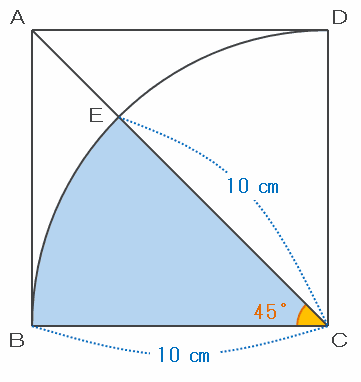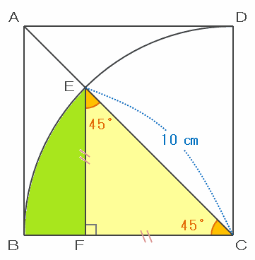つまり、EFCは直角二等辺三角形であり、辺ECの長さはDCやBCと同じく10㎝(どれもおうぎ形CBDの半径)であることも分かります。