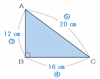 次の図のように直角三角形ABCだけを取り出して3辺の長さの比を求めてみると、短い順に12㎝:16㎝:20㎝=3:4:5となります。