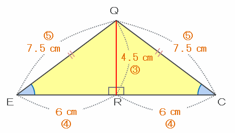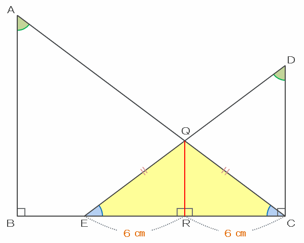 したがって、点Qから辺ECに対して垂線を引き、その交点をRとすると、二等辺三角形QECは2つの合同な直角三角形に分割され、辺ERとRCの長さはどちらも12÷2=6㎝になります。