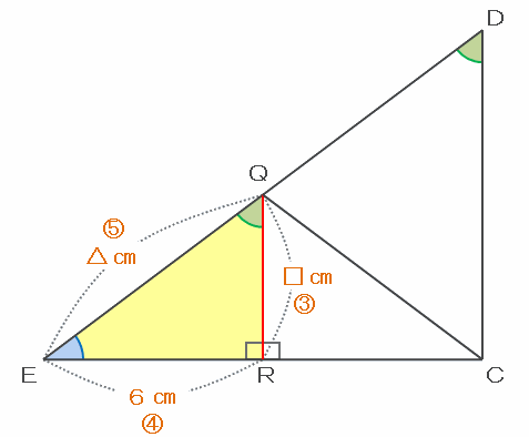 つまり、三角形QREの3辺の長さも、DCEと同じく3:4:5になっているはずなので、辺ERの長さである6㎝は比の4、そして比の1は6÷4=1.5㎝です。