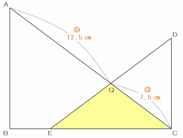 次の図の辺ACは20㎝、そしてさっきの問題で辺QCは7.5㎝であることが分かったので、辺AQの長さは20-7.5=12.5㎝です。