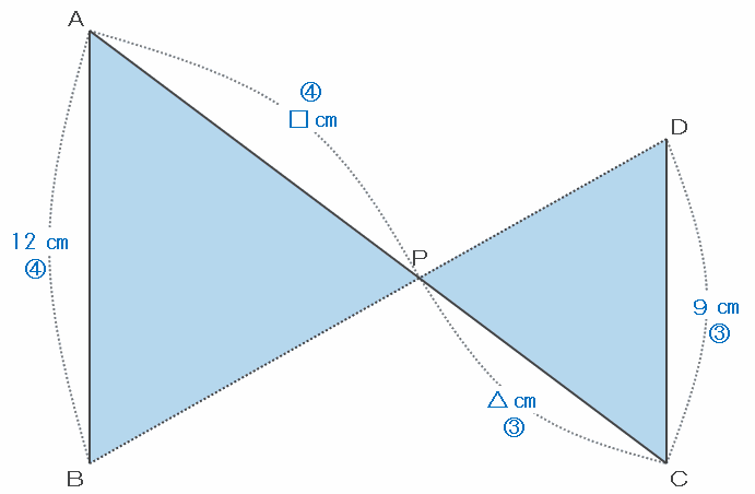 次の図の三角形ABPとCDPは8の字相似で、辺ABとDCの長さの比は12㎝:9㎝=4:3なので、辺APとPCの長さの比も4:3になっているはずです。
