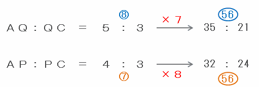 のように、辺ACの長さを表す比がそろっていないので、次の図のようにそれぞれの比の合計を8と7の最小公倍数である56にそろえてみると、