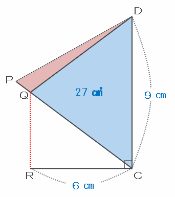 次の図の三角形CDQは、底辺をCD=9㎝とすると、高さはRC=6㎝とみなすことができるので、その面積は9×6÷2=27㎠になります。