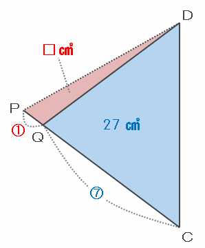 つまり、上の図の三角形DPQの面積を□㎠とおくと、「1:7=□㎠:27㎠」という比例式が作れるので、DPQの面積は1×27÷7=7分の27㎠になります。