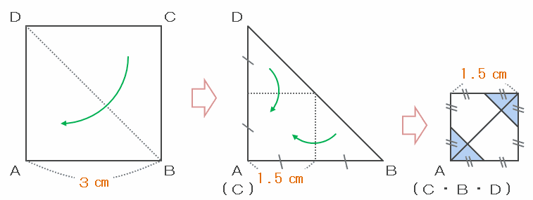 最初の正方形ABCDは1辺の長さが3㎝ですが、それを次の図のように2回折ると、最後にできた正方形は1辺の長さが3÷2=1.5㎝になります。